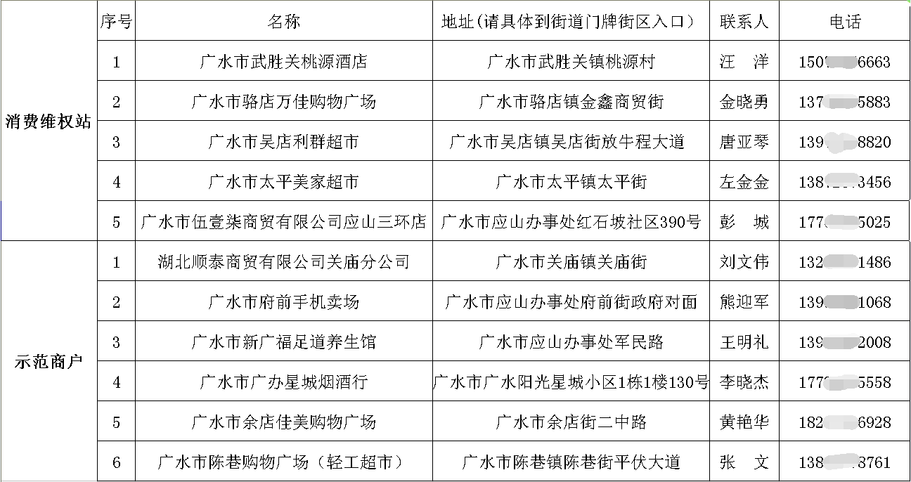 2021年,“放心消费在随州”创建活动列入市政府重点工作事项,也是三年来市场监管系统“放心消费在随州”创建活动的收官之年。广水市场监督管理局和社会各界积极组织创建,广大经营者踊跃参入创建,广水市消费环境得到明显改善,增强了消费者的安全感、幸福感、获得感。因此,为进一步提升广水市消费环境,树立创建标杆,发挥示范效应,广水市场监督管理局经过社会各界和广大人民群众推荐,2021年在全市范围内新创建“消费维权站(点)”5家,“放心消费示范户”6家。现将上述11家“放心消费维权站”和“放心消费示范户”对社会进行公示,具体名单位如下: