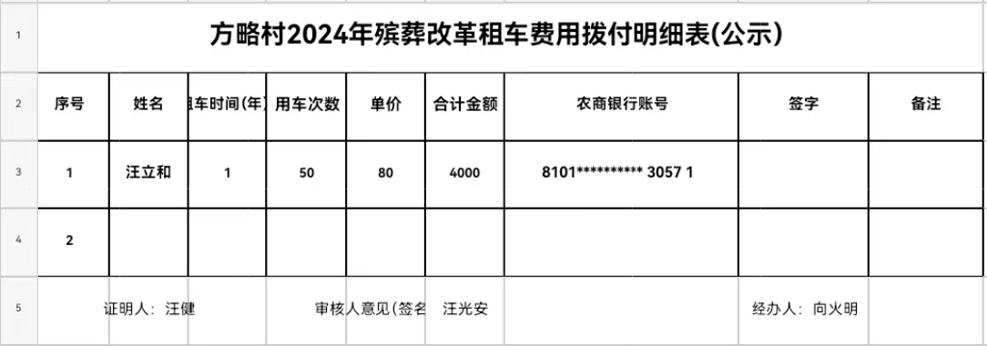 方略村2024年殡葬改革租车费用拨付明细表(公示)