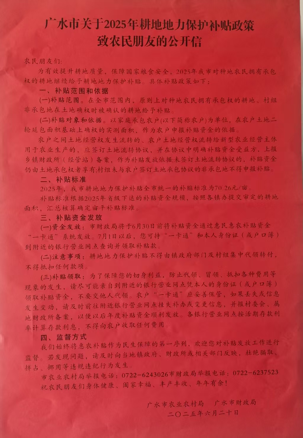 广水市关于2025年耕地地力保护补贴政策致农民朋友的公开信