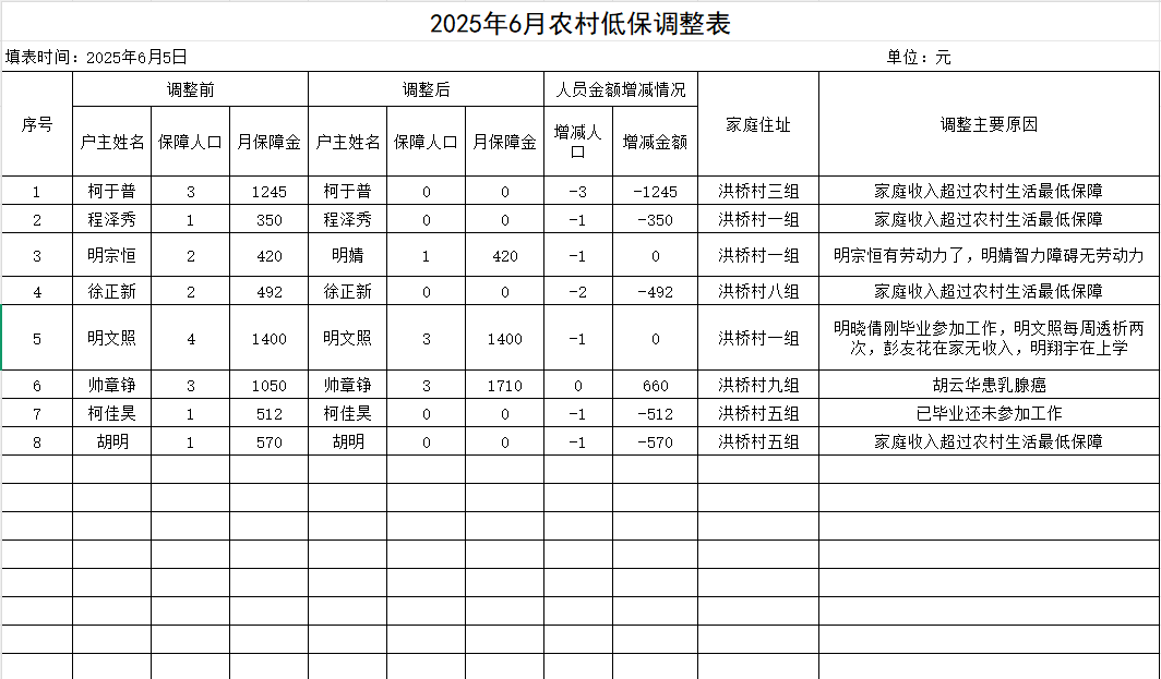 洪桥村低保调整情况