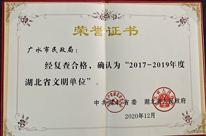 近日,广水市民政局被省委、省政府复查评为“2017-2019年度湖北省文明单位”。