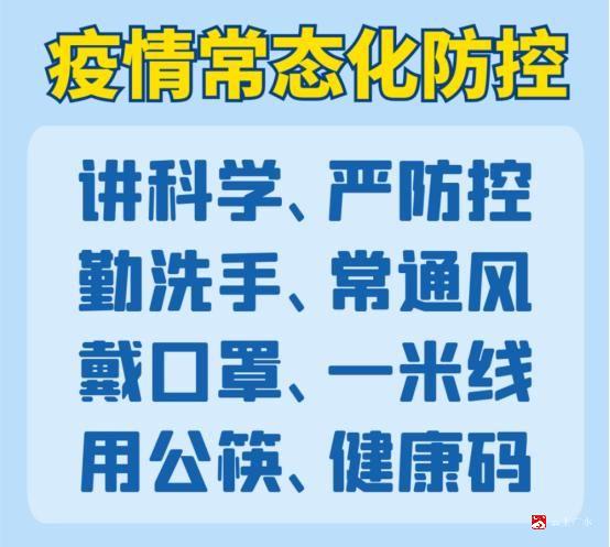 四、广大群众要继续时刻保持良好的个人防护意识,养成随身携带口罩,科学规范佩戴口罩(尤其是在乘坐公共交通工具和在公共场所活动时)、勤洗手、常通风、保持安全社交距离的卫生习惯;不扎堆、不聚会,倡导健康生活方式。五、如出现发热、咳嗽、腹泻、乏力等症状,要佩戴一次性医用口罩及以上级别口罩,及时到就近的发热门诊进行排查和诊疗,就医过程尽量避免乘坐公共交通工具。六、接种新冠疫苗是预防控制新冠肺炎传播的最经济、最有效、最方便的措施,更是每一位公民应尽的责任和义务,请符合新冠疫苗接种条件的群众积极主动参与新冠病毒疫苗接种,携手共筑全民免疫屏障。
