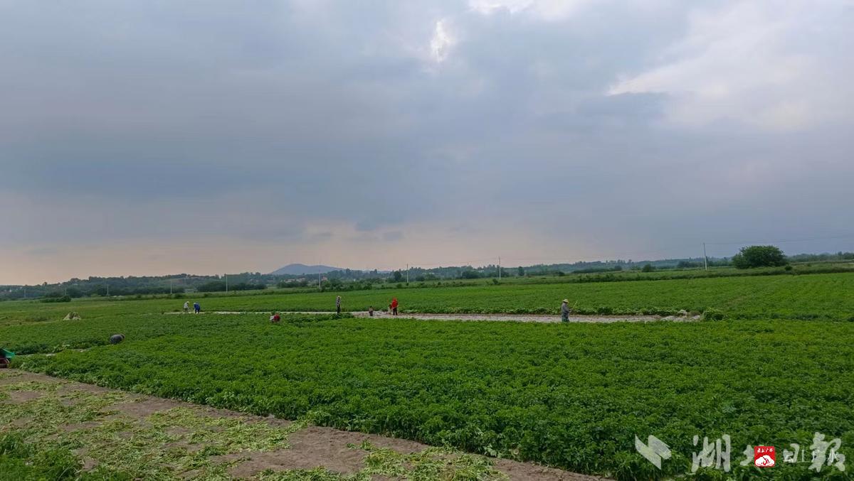5月30日,广水市长岭镇土滩埔村特色农业示范片区,农户们卖力拔出土豆秧,滚圆的土豆破土而出,随即被收入袋中。