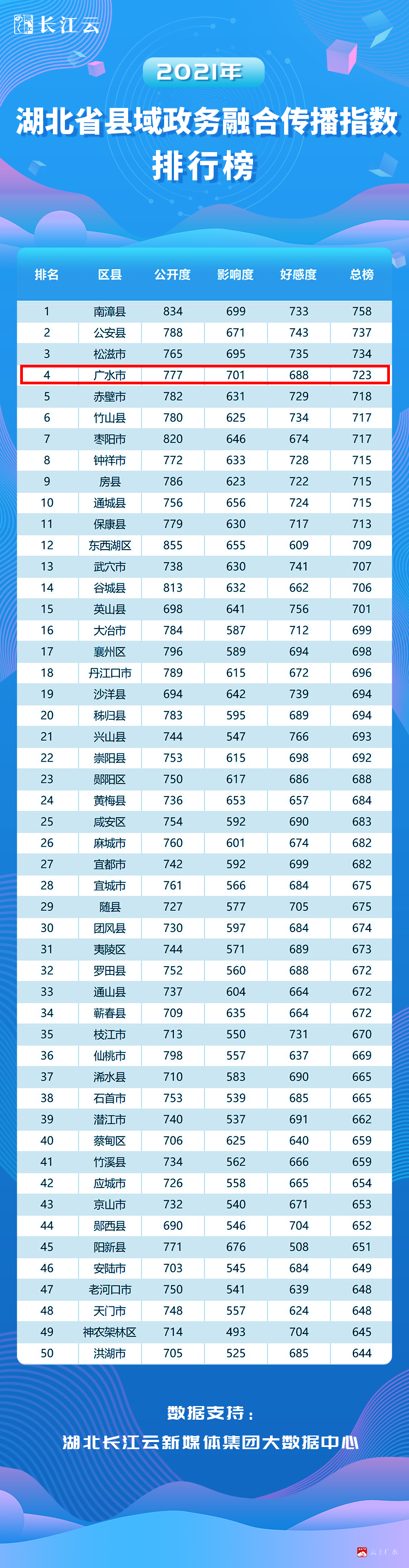 6月6日,湖北长江云新媒体集团大数据中心发布《2021年度湖北省县域政务融合传播指数排行榜》,广水市位列全省县市区第四名。从榜单发布的“公开度”“影响度”“好感度”三个方面的数据表明,广水市融媒体中心政务融合传播矩阵基本形成,整体传播能力呈向上发展态势,主流舆论阵地建设成效明显,传播力、引导力、影响力、公信力持续增强。
