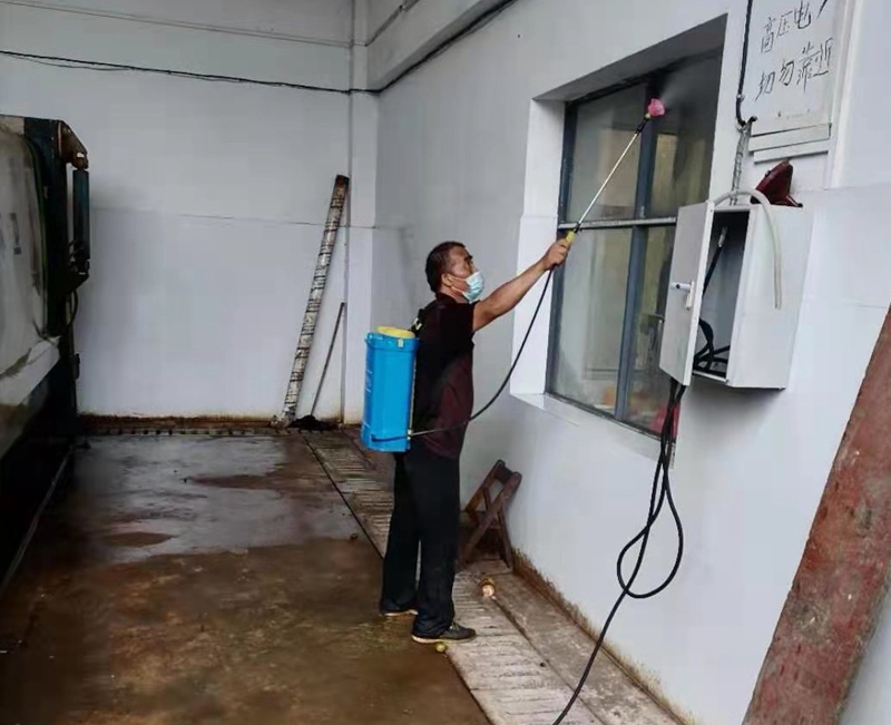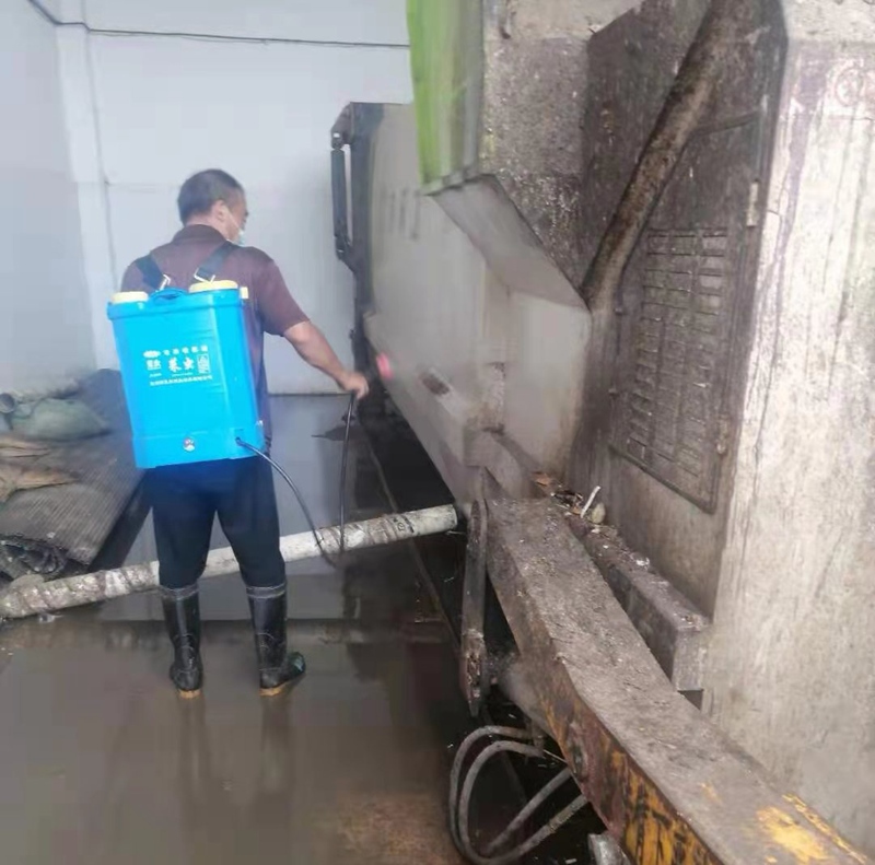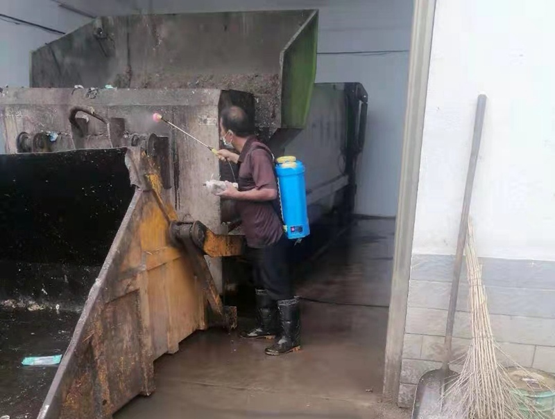 对于垃圾中转站及一些卫生死角,工作人员采用人工喷洒方式进行消杀,用装满84消毒液的电动喷雾器,进行地毯式精准消毒。由于中转站是生活垃圾的集中点,病菌较集中,做好垃圾消杀是重中之重,工作人员须对中转站各个角落、机械设备、犄角旮旯、墙壁缝隙进行消杀,还在收运车辆出发前对车身和轮胎进行一番消毒,做好垃圾的及时清运,减少垃圾滞留时间。