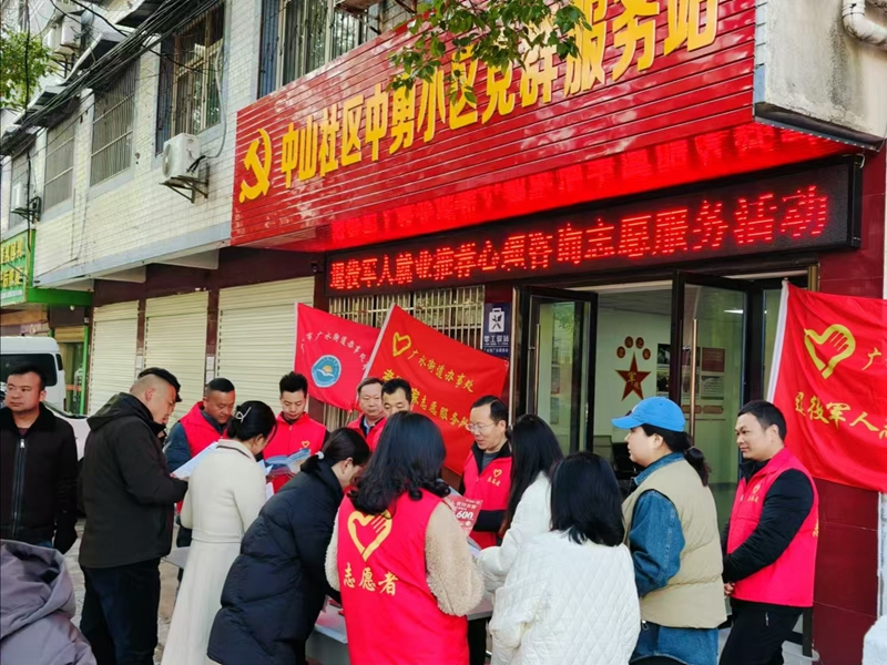 12月5日,广水市广水街道退役军人服务站联合广办老兵之家志愿服务队、广办商会,在中山社区开展退役军人政策法规宣传、就业推荐、心理咨询等志愿服务活动,提升了广大退役军人的获得感、幸福感和安全感。
