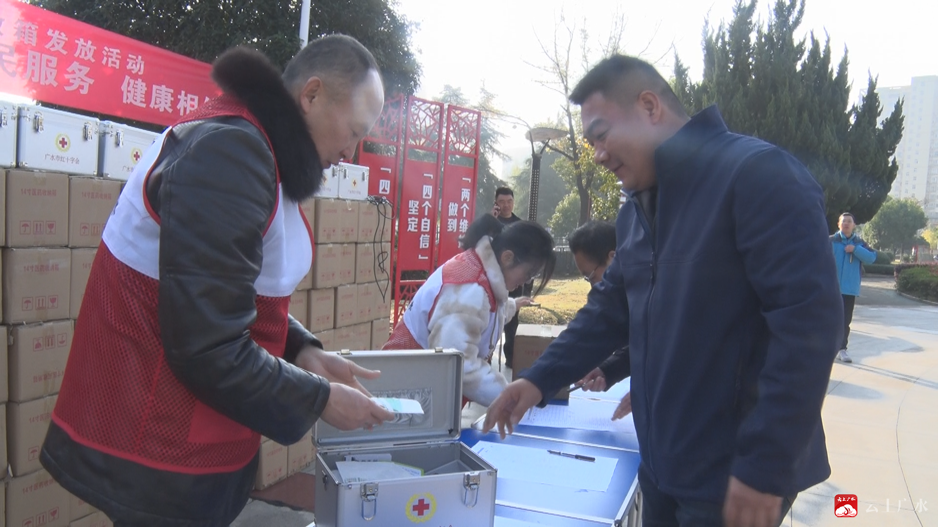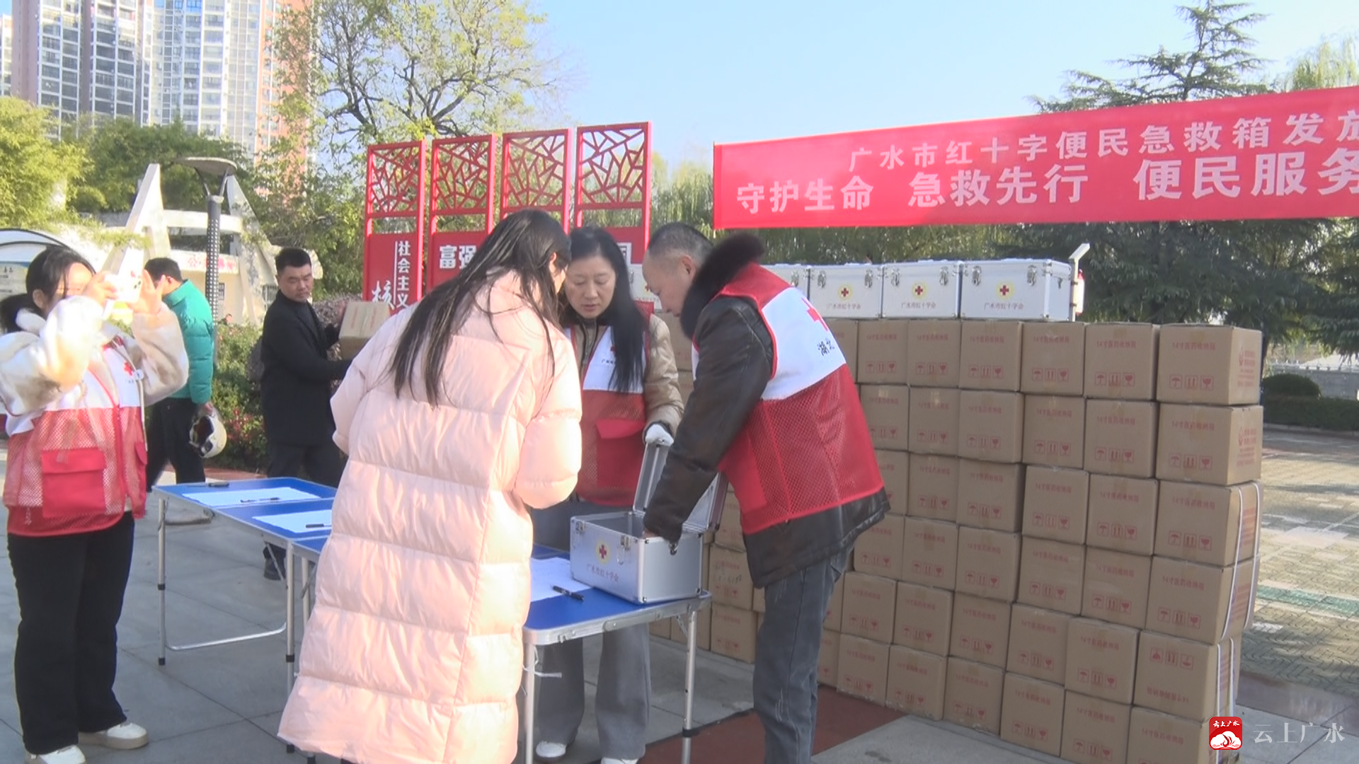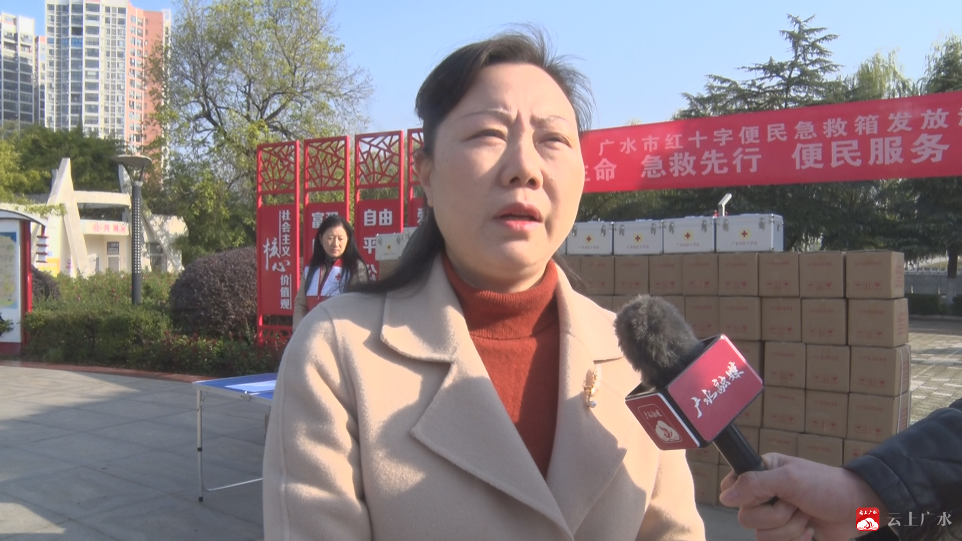 市红十字会党组书记、常务副会长 杨蕾:“今天,市红十字会集中购买544件便民急救箱,现场集中发放到各镇(办)、市直各单位,主要安放便民服务中心及窗口服务单位,为的是给广大市民提供更为便捷、贴心的服务,切实打通便民服务‘最后一公里’,让群众实实在在感受到红十字志愿服务‘救’在身边,共同构建安全、健康的社会环境。”
