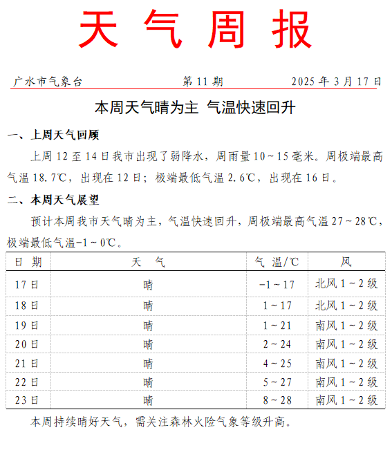 本周天气晴为主 气温快速回升
