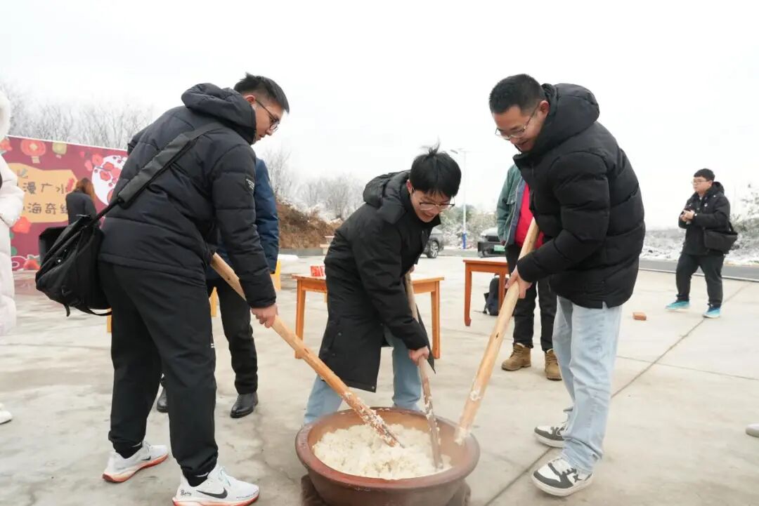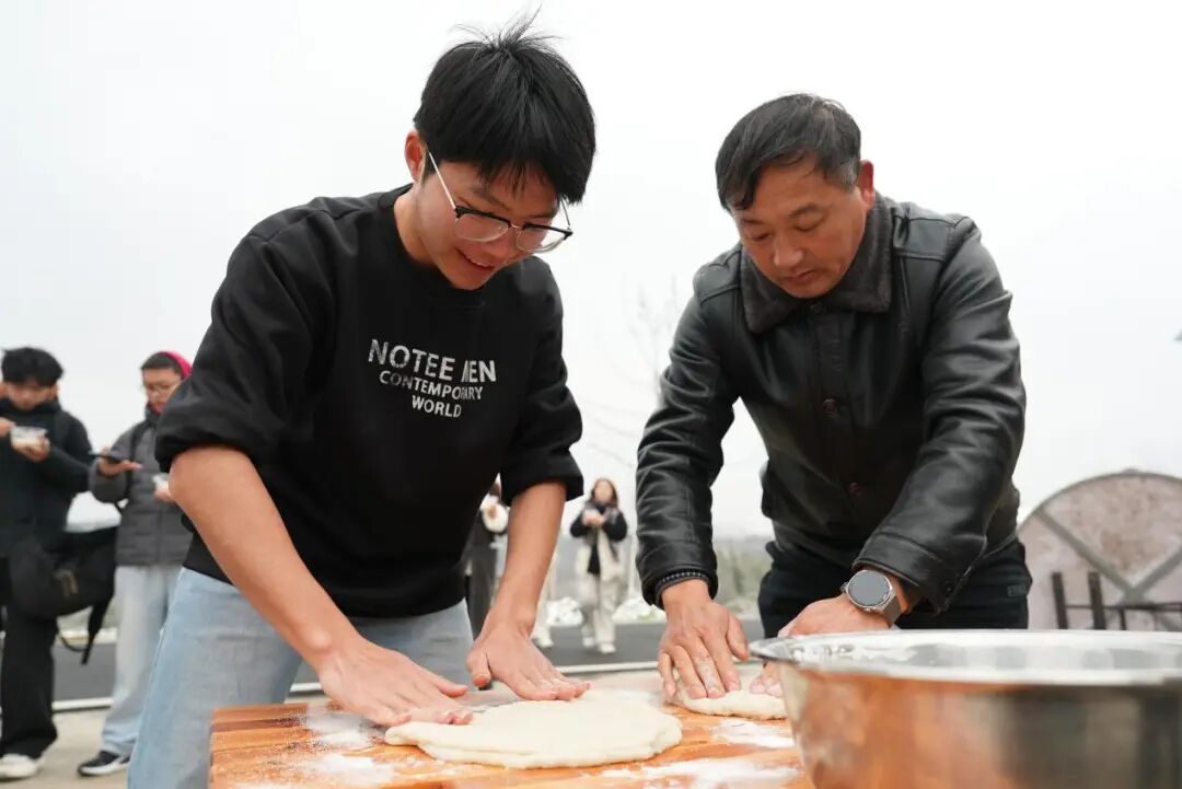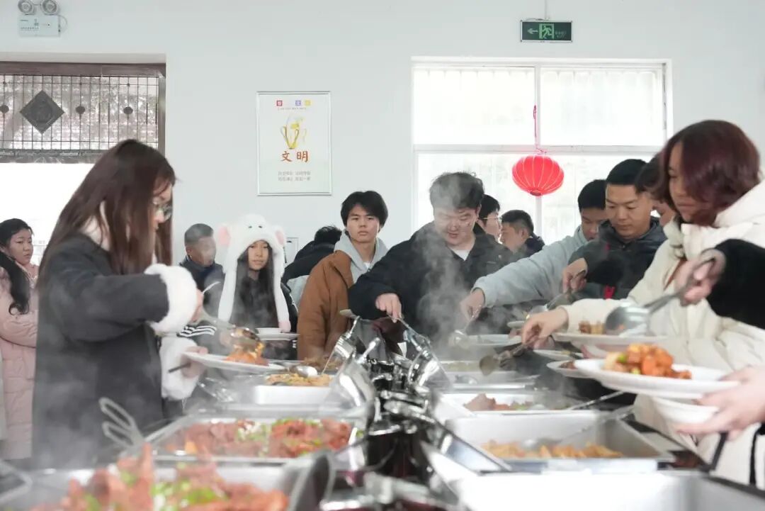 在柏林村村委会广场上,年猪民俗文化展陈列着传统农具与年俗物件,还原了质朴的乡村年节场景。中午,柏林村中心小学食堂,酸菜血旺、萝卜炖肉等“杀猪菜”香气扑鼻,“拐子饭”“鸽子汤”“应山滑肉”等广水标志性菜肴引人垂涎。大学生们围坐长桌,品尝着地道的乡土年味、独特的广水味道,连连赞叹。