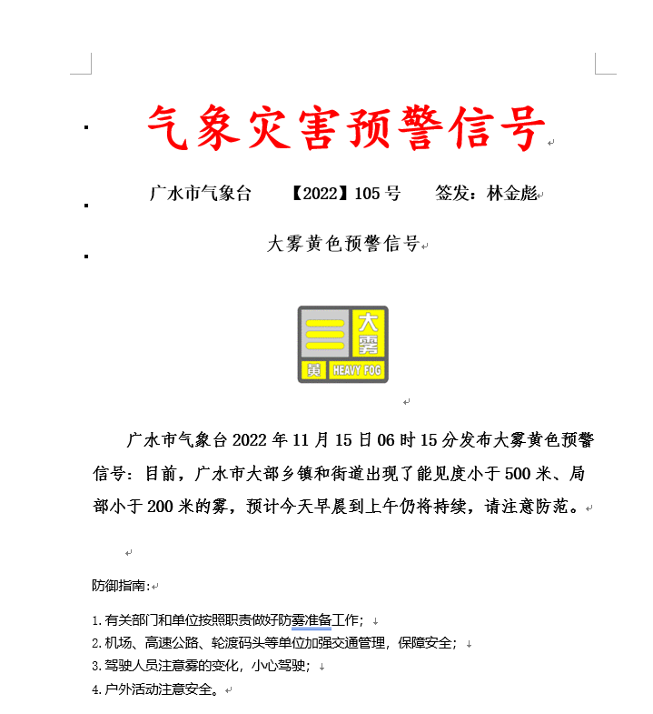大雾黄色预警信号