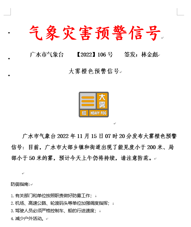 大雾橙色预警信号