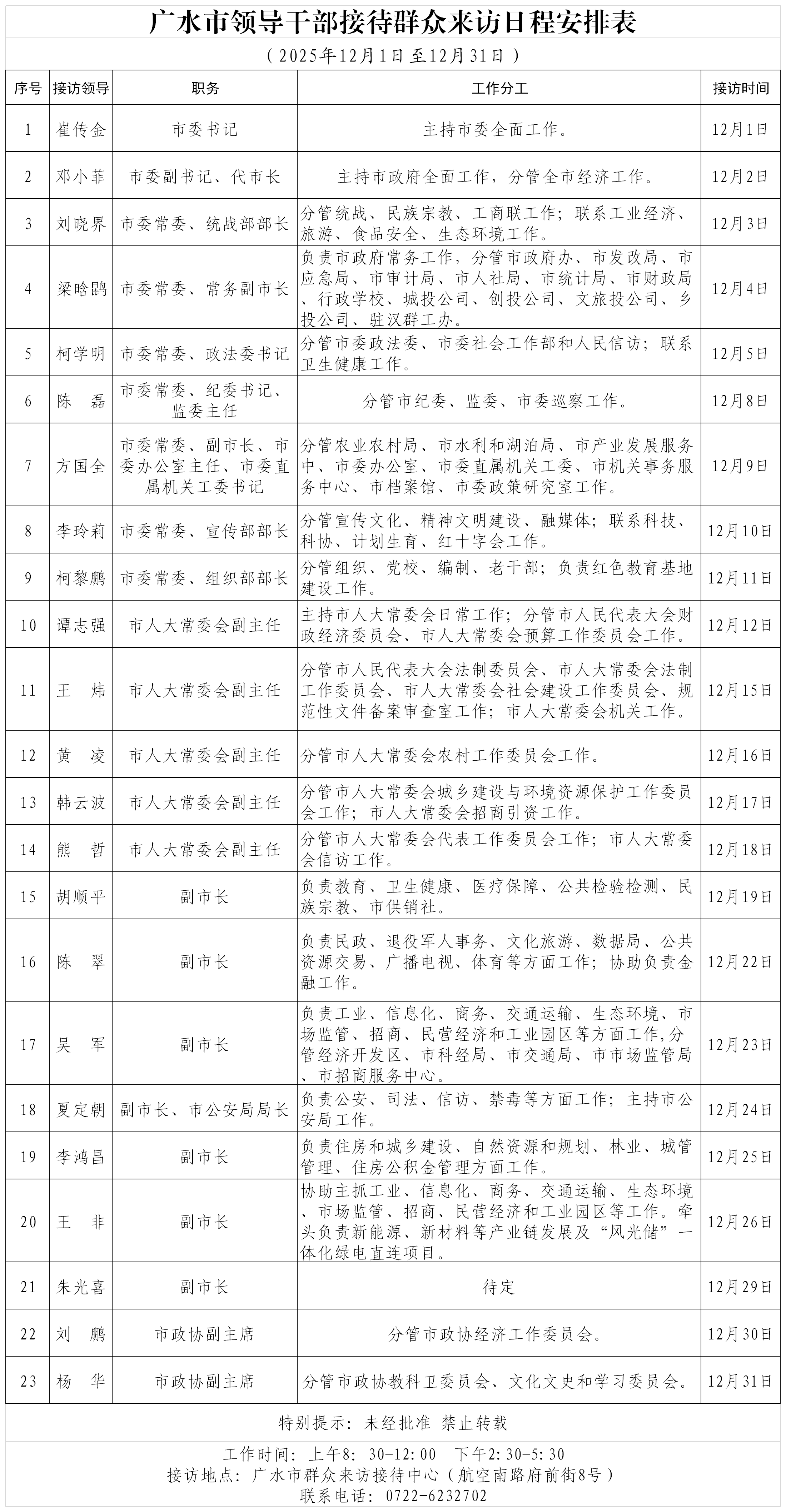 为深入贯彻落实习近平总书记关于加强和改进人民信访工作的重要思想,进一步畅通和规范群众诉求表达、利益协调、权益保障通道,依法按政策及时就地解决群众合理诉求,现将我市2025年12月份领导干部接待群众来访日程安排公布如下。